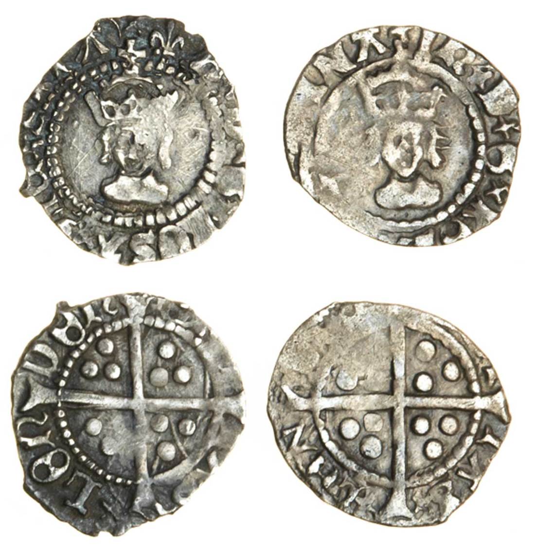 Henry VIII (1509-47), second coinage, Halfpennies (2), London, 0.27g, m.m. large lis/-, h d g rosa sie spia, saltire stops both sides, narrow hair, rev. civi tas lon don; 0.33g, m.m. arrow/-, h d g rosa [ ] spina, Roman ns both sides, saltire stops both sides, wider hair (N.1815; S.2356; Stewartby p.472, the first pl.33/590 this coin), the second with a weak area, otherwise good fine to very fine (2)