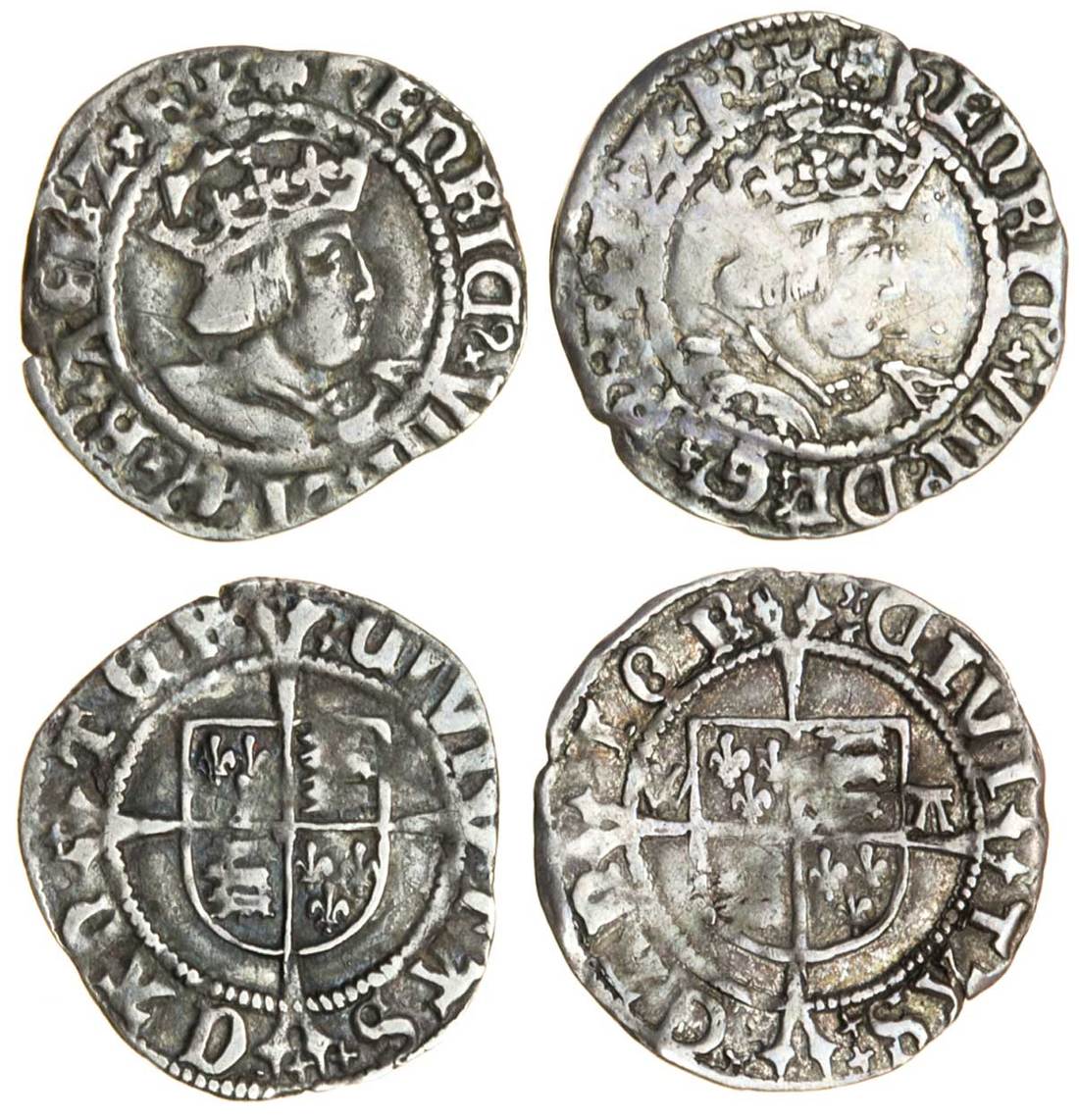 Henry VIII (1509-47), second coinage, Halfgroats (2), Canterbury under Archbishop Warham, 1.32g, m.m. Warham’s uncertain mark/-, henric viii di g r agl z f, reversed Roman d for c, saltire stops, crowned bust right, rev. civi tas can tor, saltire stops, shield over long cross fourchée, saltires in forks; 1.30g, as previous, but w a beside shield and no saltires in forks (N.1803, 1802; S.2344, 2343; Stewartby p.472), fine to nearly very fine, rare with Roman letters (2)