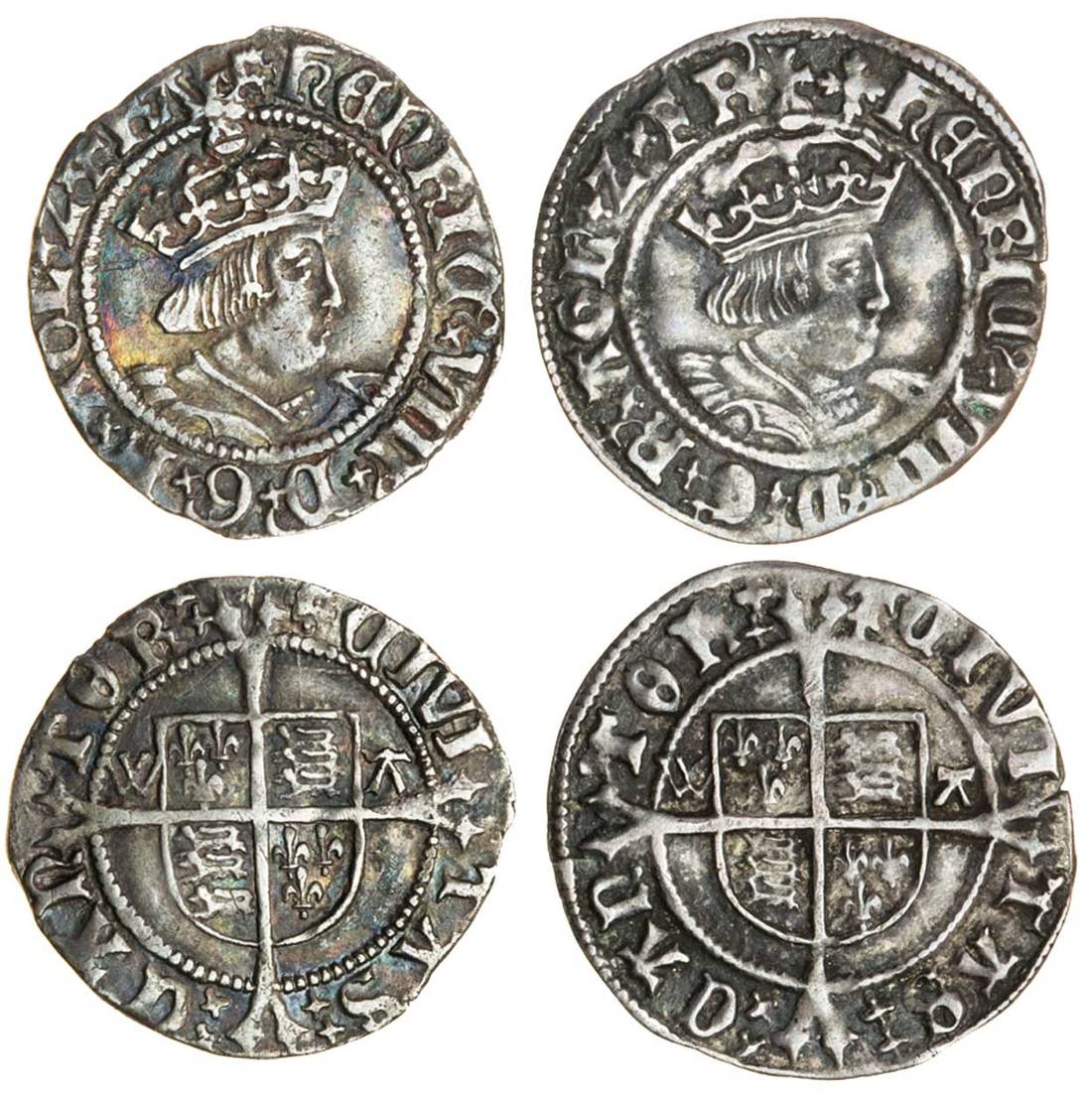 Henry VIII (1509-47), second coinage, Halfgroats (2), Canterbury under Archbishop Warham, 1.26g, m.m. Warham’s uncertain mark, henric viii d g r agl z fra, saltire stops, crowned bust right, rev. civi tas can tor, saltire stops, shield on long cross fourchée, w a beside shield; 1.16g, m.m. cross patonce/t, agl z fr, otherwise as previous (N.1802; S.2343; Stewartby p.472), the second creased, both very fine (2)