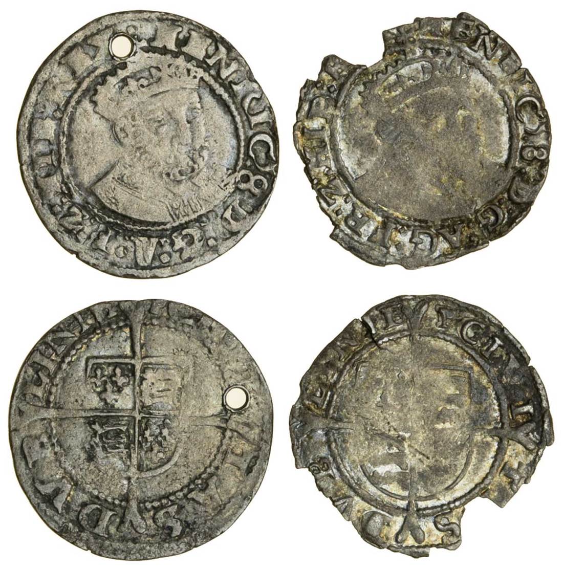 Ireland, Edward VI (1547-53), coinage in the name of Henry VIII, Threepences (2), London obv. die, 1.19g, m.m. harp, henric 8 d g a f z hib rex around crowned three-quarters facing bust 6, lozenge stops, rev. civi tas dvb linie, long cross over shield; 0.94g, m.m. p, ag fr z hib (S.6491; D&F 221), the first nearly very fine but pierced, the second chipped, nearly fine, both rare (2)