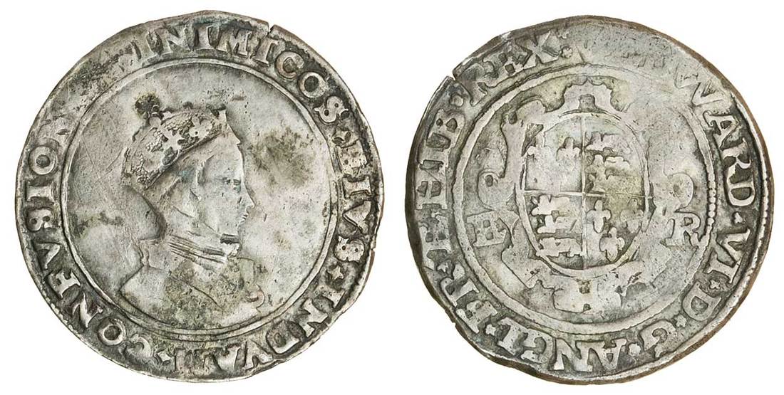 Edward VI (1547-53), Shilling 8oz, (1549), 4.66g, Durham House, m.m. bow, inimicos eivs indvam confusione, wire line, bust right, lozenge stops, rev. edward vi d g angl fr et hib rex, lozenge stops, garnished shield dividing e r (N.1925; S.2470; Stewartby p.532; Bispham 2/B), polished and retoned, good fine, very rare