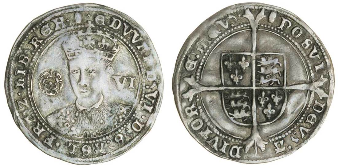 Edward VI (1547-53), fine issue, Sixpence, 3.02g, m.m. tun, edward vi d g agl fra z hib rex, facing bust, rose left, vi right, rev. posvi dev adivtore mev, shield on long cross fourchée (N.1938; S.2483), wavy flan, nearly very fine
