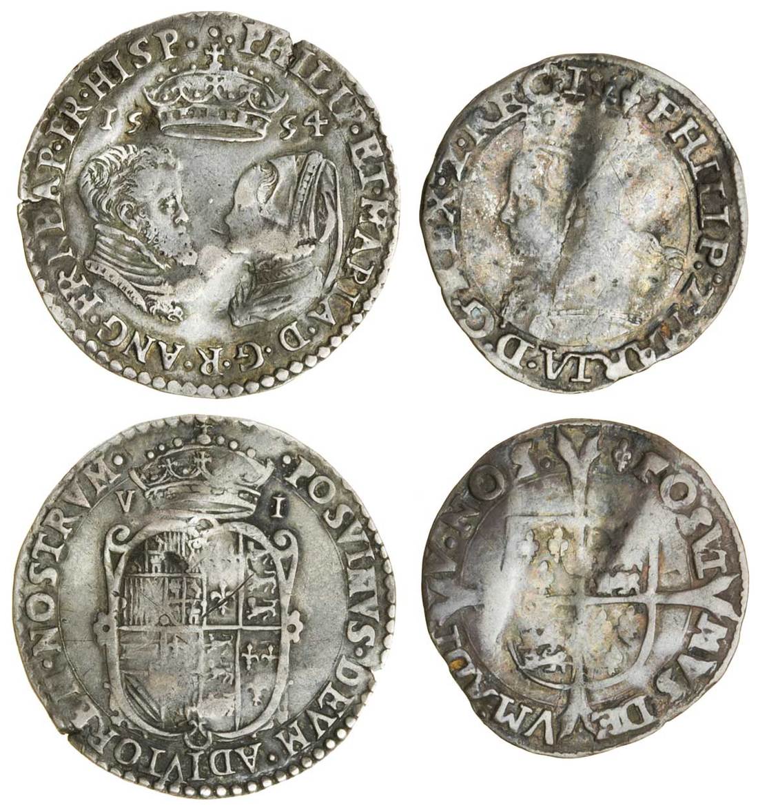 Philip and Mary (1554-58), Sixpence, 1554, 2.93g, m.m. none, philip et maria d g r ang fr neap pr hisp, facing busts, crown above dividing date, rev. posvimvs devm adivtorem nostrvm, crowned oval shield dividing v i; Groat, 1.88g, m.m. lis, philip z maria d g rex z regi, crowned bust left, rev. posvimvs devm adiv nos (N.1970, 1973; S.2505, 2508), the first creased and dented, good fine, the second creased, fair (2)