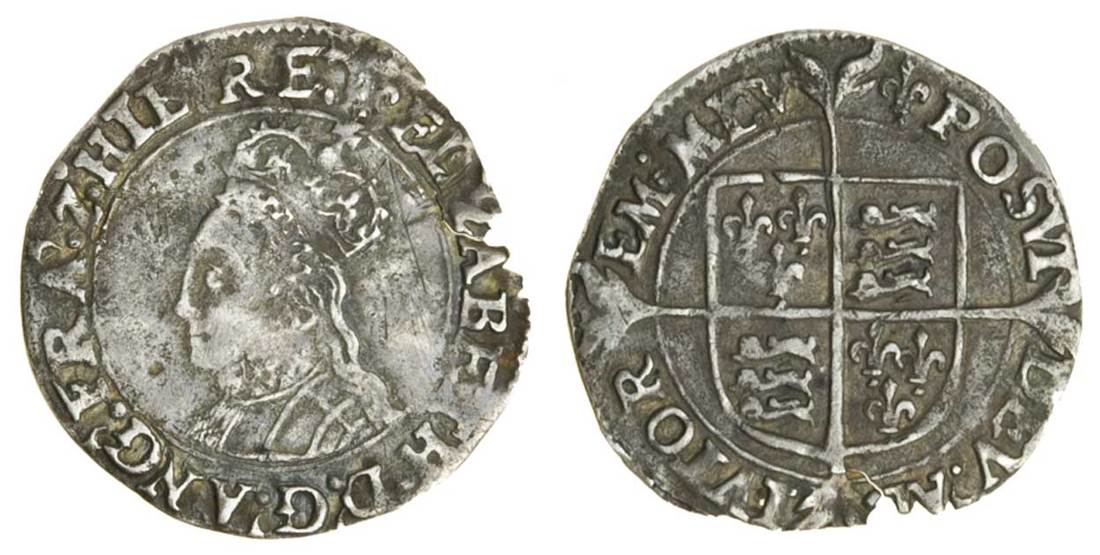 Elizabeth I (1558-1603), Halfgroat, first issue, 0.94g, m.m. lis, elizabeth d g ang fra z hib regi, crowned bust left, rev. posvi dev adivtorem mev, shield on long cross fourchée (N.1987; S.2552), cracked with edge loss, very fine, very rare