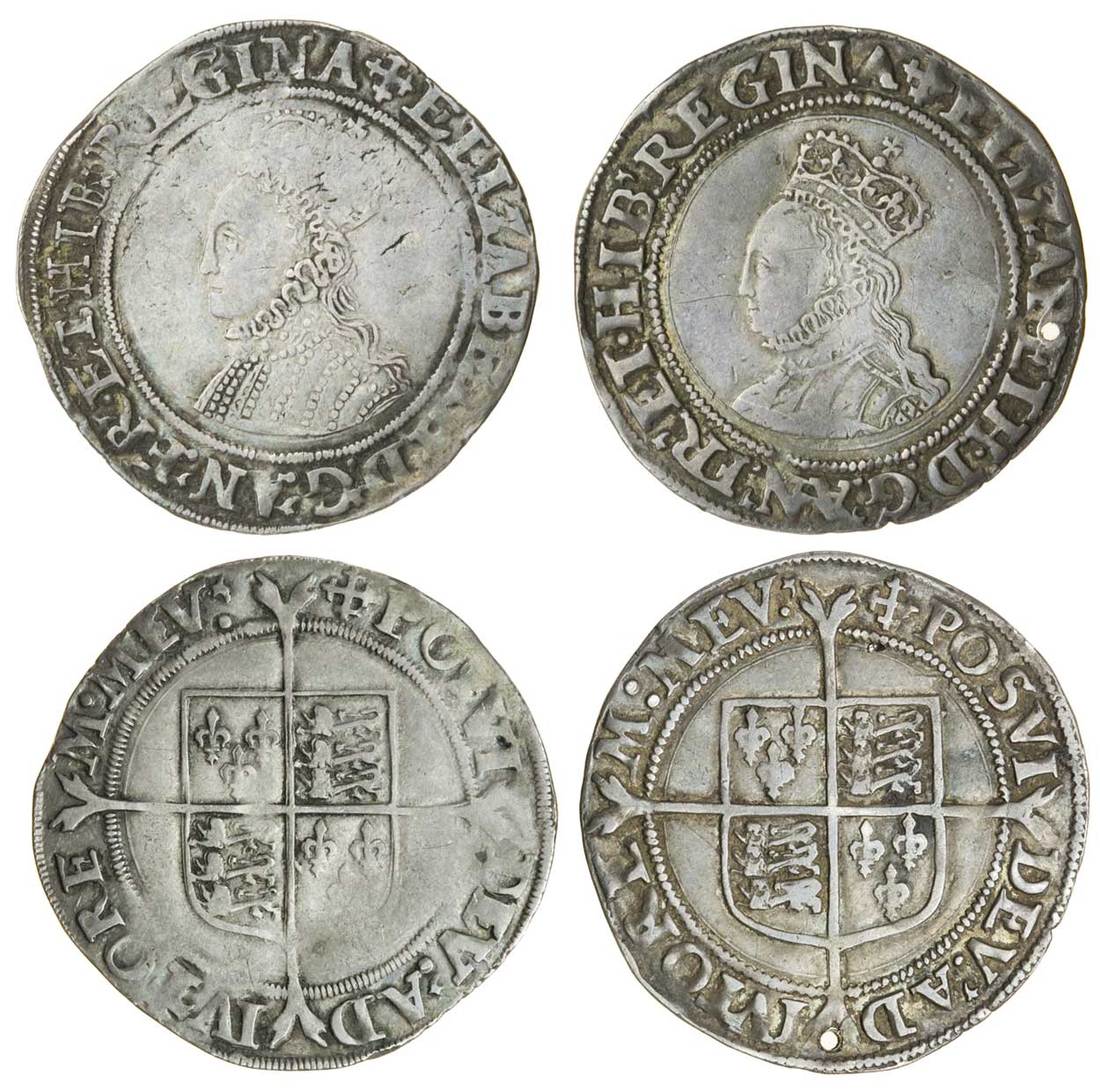 Elizabeth I (1558-1603), second issue, Shillings (2), 6.08g, m.m. cross crosslet, elizabeth d g an fr et hib regina, crowned bust 1A left, rev. posvi dev adivtorem mev, shield on long cross fourchée; 5.93g, bust 3C, otherwise as previous (N.1985; S.2555A, 2555), good fine to nearly very fine, the second pierced (2)