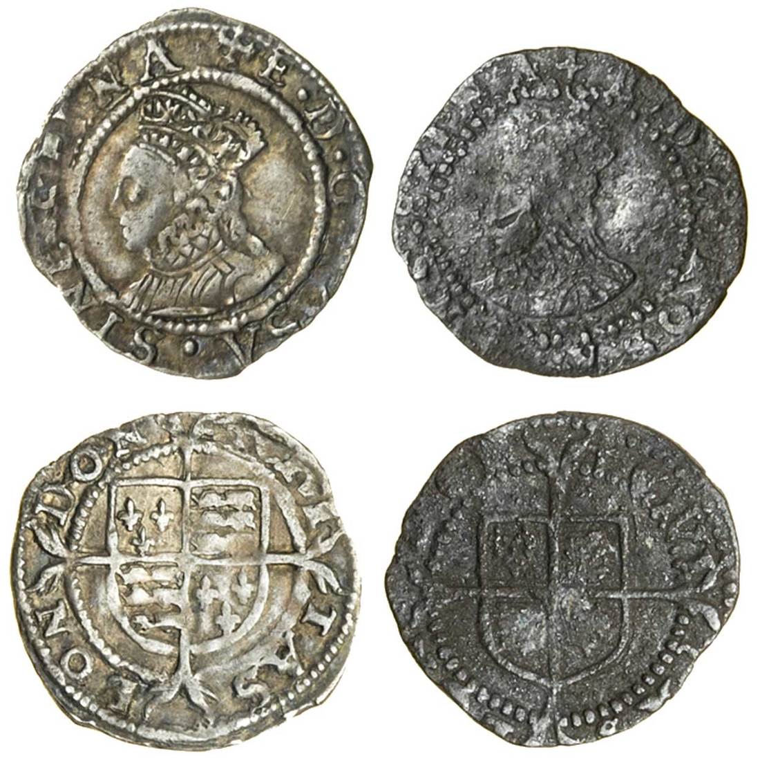Elizabeth I (1558-1603), second issue, Penny, 0.55g, m.m. cross crosslet, e d g rosa sine spina, crowned bust left, rev. civi tas lon don, shield on long cross fourchée; fifth issue, 0.45g, m.m. plain cross (N.1988, 2001; S.2558, 2575), the first attractively toned, the second with darkly toned, very fine (2)