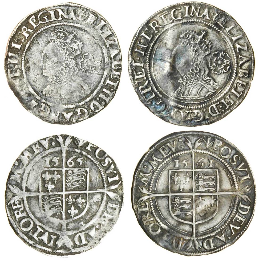 Elizabeth I (1558-1603), third issue, Sixpences (2), 1561, 2.96g, m.m. pheon, elizabeth d g ang fr et hi regina, crowned bust left, rose behind, rev. posvi dev adivtorem mev, shield on long cross fourchée; 1565, 2.93g, m.m. rose/rose over pheon, as previous; (N.1997; S.2560, 2561), the first creased with a contact mark, almost very fine, the second, good fine and rare (2)