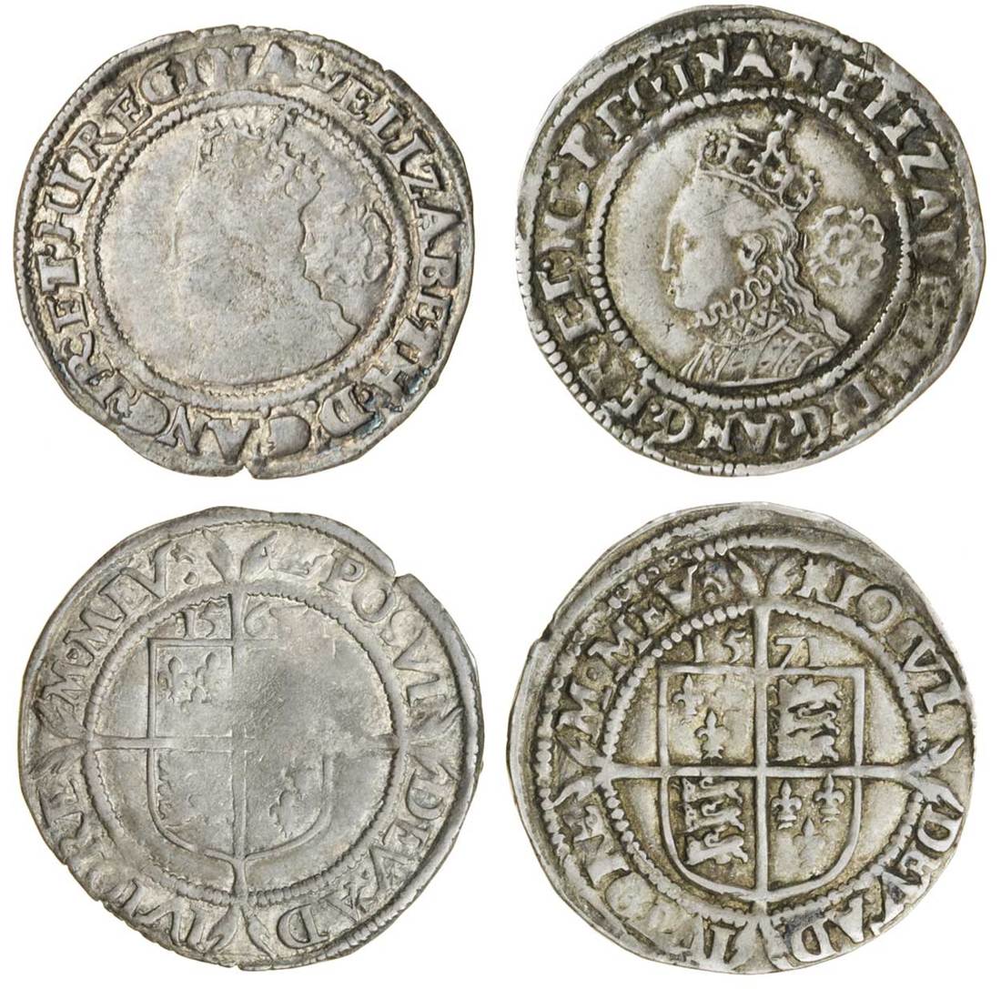 Elizabeth I (1558-1603), third issue, Sixpences (2), 1568, 3.02g, m.m. coronet, elizabeth d g ang fr et hi regina, crowned bust left, rose behind, rev. posvi dev adivtorem mev, shield on long cross fourchée; 1571, 3.22g, m.m. castle, as previous; (N.1997; S.2562), the first with flat centres, fine, the second, very fine (2)