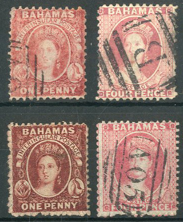1862 no watermark, perf. 11½, 12, 1d. carmine-lake and 4d. dull rose, and perf. 13 1d. brown-lake and 4d. dull rose, the 1d. lake with the merest trace of a cancellation at foot, the others cancelled "A05" or "B" (perf. 11½, 12 4d.); the first two with a couple of faults, the last 4d. fine. Sc. 5, 6, 8, 9; S.G. 8, 10, 17, 18