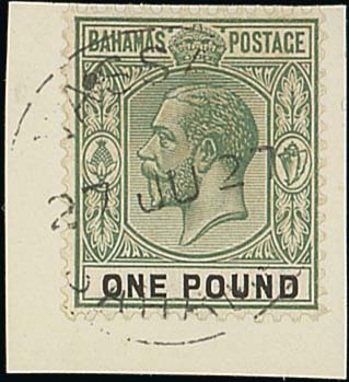 1912 £1 dull green and black, neatly cancelled with Nassau 1927 c.d.s. and tied on small piece; fine used. Sc. 56; S.G. 89, £350. Photo