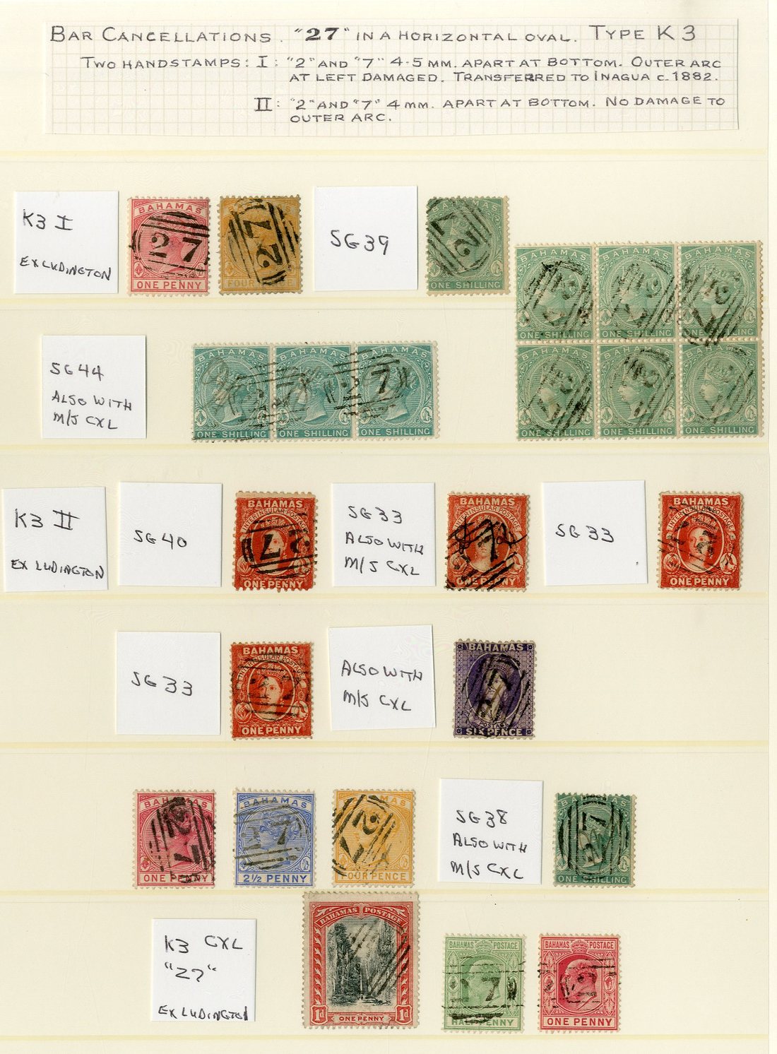 A collection of obliterators on a variety of mainly later QV values and comprising "A05" (7), "27" (24 with 1/- strip of three and a block of six), and "B" (18 with a 1/- block of twelve); largely fine strikes