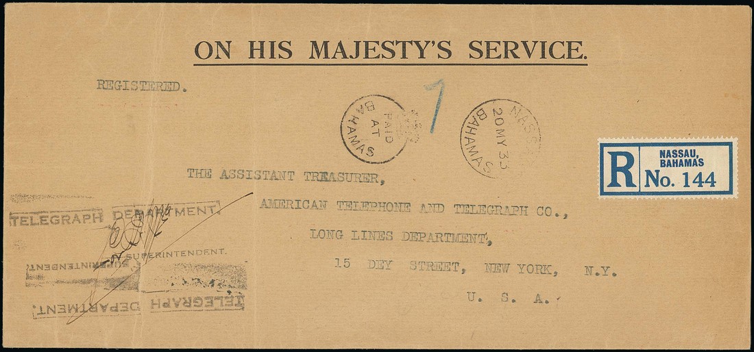 1933 (20 May) OHMS envelope (226x105mm.) registered from Nassau to the American Telephone Co. in New York, showing a fine strike of the very rare single-ring Crowned Circle "paid/at/bahamas" handstamp (CC3) alongside despatch datestamp and with arrival cachet at foot. One of only a handful of examples recorded. Photo