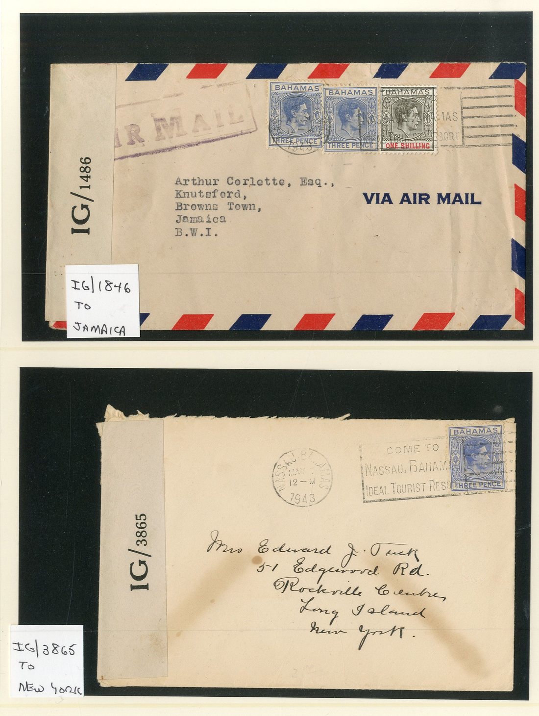 1940-45 selection of censored covers to Canada (2), Canal Zone, Cuba (2), Ireland, Jamaica,, New Zealand, Trinidad and USA (8), variously rated and showing a range o different censor labels; also 1942 card from San Salvador to Nassau with crowned "g/24" cachet in violet