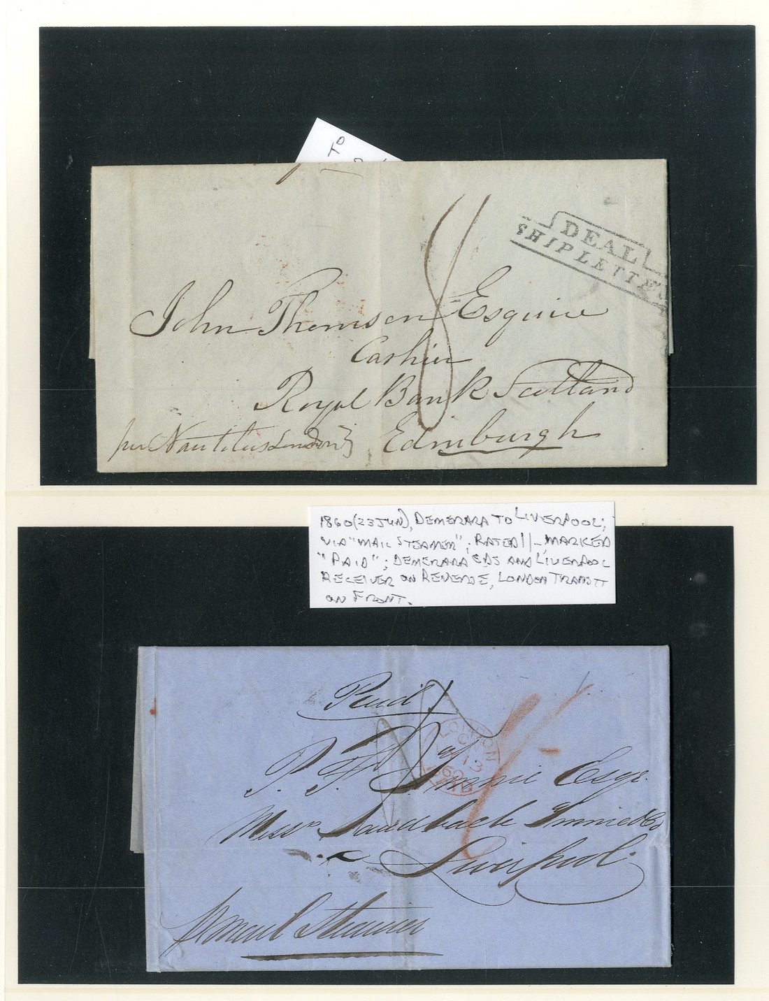 1839 (12 Nov.) entire letter from Demerara to Edinburgh, rated "8" and showing fine step-type "deal/ship letter", and 1860 (23 June) entire letter from Demerara to Liverpool, rated "5" and "1/-" and showing despatch and arrival (13.7) datestamps on reverse