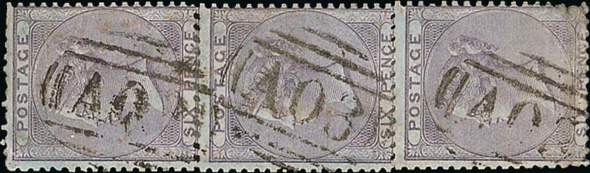 6d. lilac vertical strip of three each clearly cancelled "A03"; severed and rejoined, and the stamp at foot with small faults though a rare and probably unique multiple. R.P.S. Certificate (1974). S.G. Z3. Photo