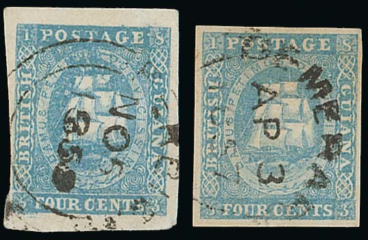 1853-55 4c. pale blue with clear to very large margins, and a further example with good regular margins and with white line above value tablet missing, having been retouched, both cancelled with Demerara double-arc datestamp; both with small faults though of fine appearance. Sc. 10b, 11b; S.G. 20, 20a, £1,700. Photo