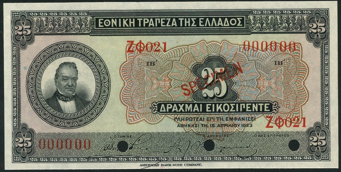 (x) National Bank of Greece, specimen 25 drachmai, 15 April 1923, red serial number 021-000000, black, pink and pale green, George Stavros at left, value at right and at each corner, three signatures below, reverse brown and pink, coin of Metapontum at left and right , also an issued example with serial number EB067-353101