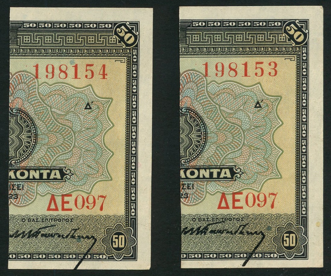 (x) National Bank of Greece, 1925 emergency issue, the right hand quarters (4) of a 50 drachmai, type of 1926, also another example with 3/4 of a left hand note and 1/4 of the right, also a torn (not cut) right hand quarters of a 50 drachmai of 1922 and a left hand 3/4 and a right 1/4 of a 50 drachmai of 1923, also the right hand quarters (?) of a 100 drachmai of 1922 and the left hand 3/4 of a 100 drachmai of 1923 and the right quarter