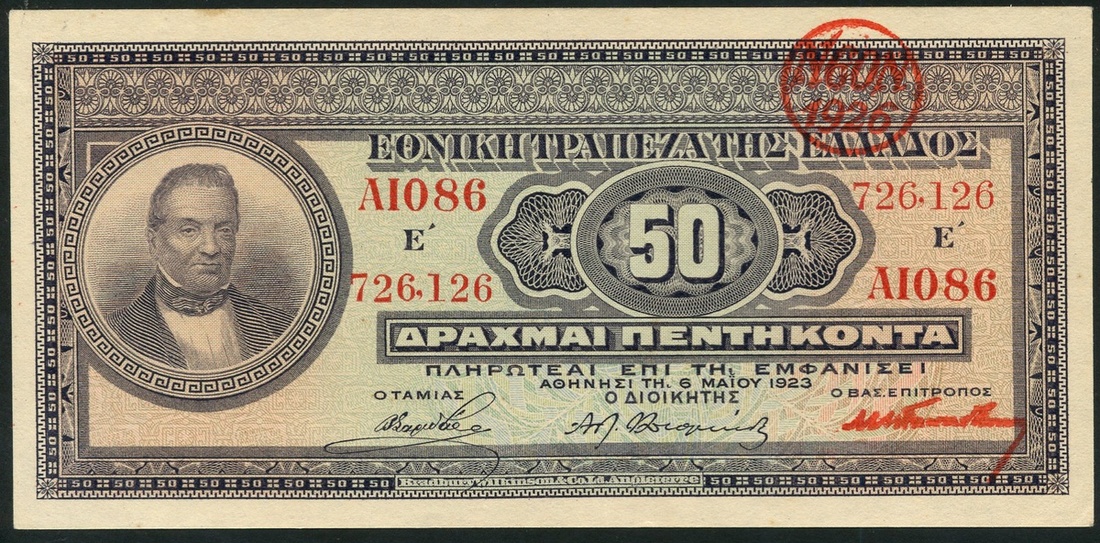 (x) National Bank of Greece, 50 drachmai, 6 May 1923, red serial number AI086-726126, mauve, pale green and pink, George Stavros at left, value at right, two signatures below, red NEON at upper right, reverse purple and pale green, Athena at centre, value at left and right and at each corner