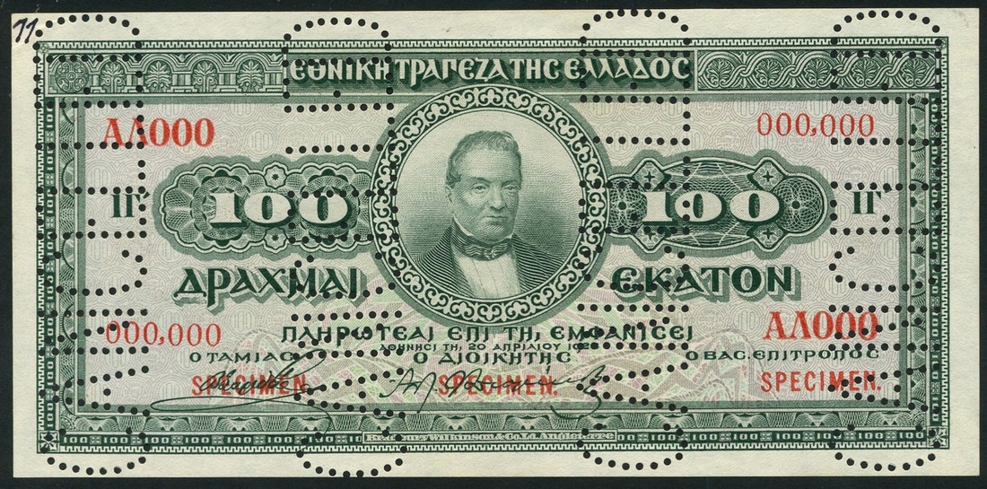 (x) National Bank of Greece, specimen 100 drachmai, 20 April 1923, red serial number AL000-000000, green and pale pink, George Stavros at centre, value at left and right, two signatures below, reverse olive-green and pink, value at left and right and at each corner