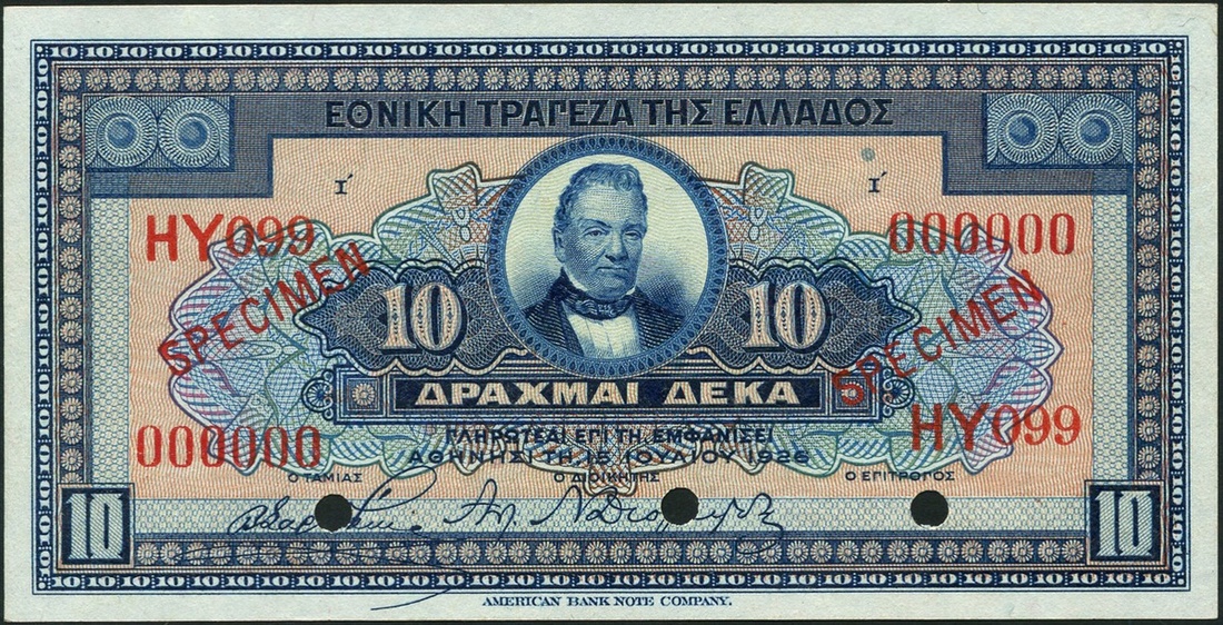 (x) National Bank of Greece, specimen 10 drachmai (2), 15 July 1926, red prefixes HY099 and HY100, blue and pale pink, George Stavros at centre, value at left and right, two signatures below, reverse blue and pink, classical coin at left and right, value at centre and at each corner