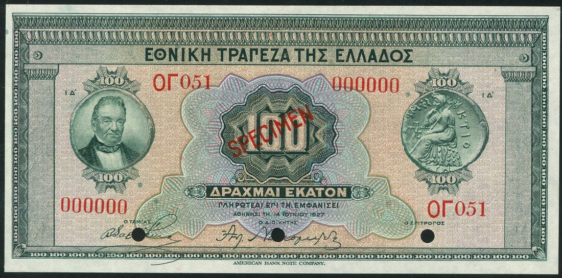 (x) National Bank of Greece, specimen 50 drachmai (2), 30 April 1927, red serial number NH050-000000, pink and pale green , George Stavros at centre, value at left and right, two signatures below, reverse purple and pale pink, classical coin at left and right, also specimen 100 drachmai, 14 June 1927, red serial number OG051-000000, green and pink, George Stavros at left, classical coin at right, reverse green and pink, classical coin at centre, value at left and right