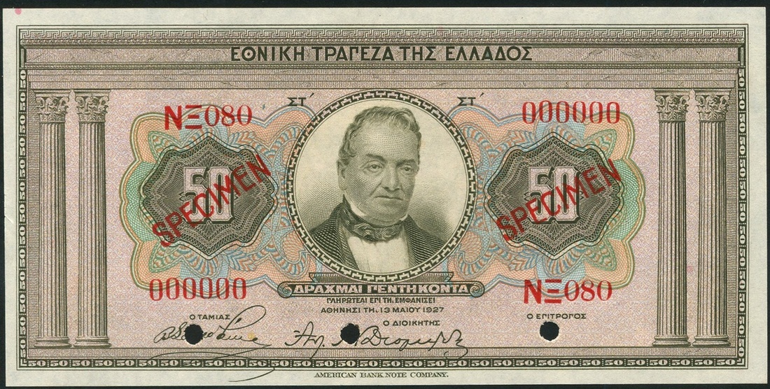 (x) National Bank of Greece, specimen 50 drachmai, 13 May 1927, red serial number NX080-000000, pink and pale green , George Stavros at centre, value at left and right, two signatures below, reverse purple and pale pink, classical coin at left and right, also specimen 100 drachmai, 25 May 1927, red serial number 000000, green and pink, George Stavros at left, classical coin at right, reverse green and pink, classical coin at centre, value at left and right
