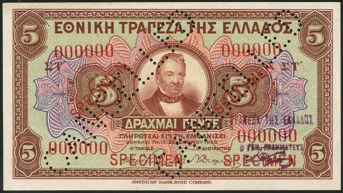 (x) Bank of Greece, Provisional issue, specimen 5 drachmai, 17 December 1926, red serial number 000000, brown, pale green and pink, George Stavros at centre, value at left and right and at each corner, purple handstamp, reverse brown, classical coin and value, also two issued examples with red prefixes MH089 and MI067, purple and black handstamps respectively