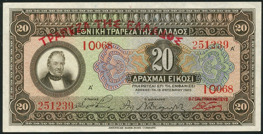(x) Bank of Greece, Provisional issue, specimen 20 drachmai, 5 November 1926, red serial number IM100-000000, purple-brown, pale green and pink, George Stavros at left, value at right and at each corner, reverse brown and pink, classical head at centre, value at left and right, also an issued example with red prefix IH068