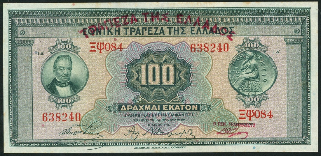 (x) Bank of Greece, Provisional issue, 100 drachmai, May/June 1927, various prefixes, serial numbers 033685/638240/850347, green and pink and pale orange, George Stavros at left, value at centre, classical coin at right, red BANK OF GREECE overprint, three signatures below, one red hand stamped, reverse green and pink, classical coin at centre