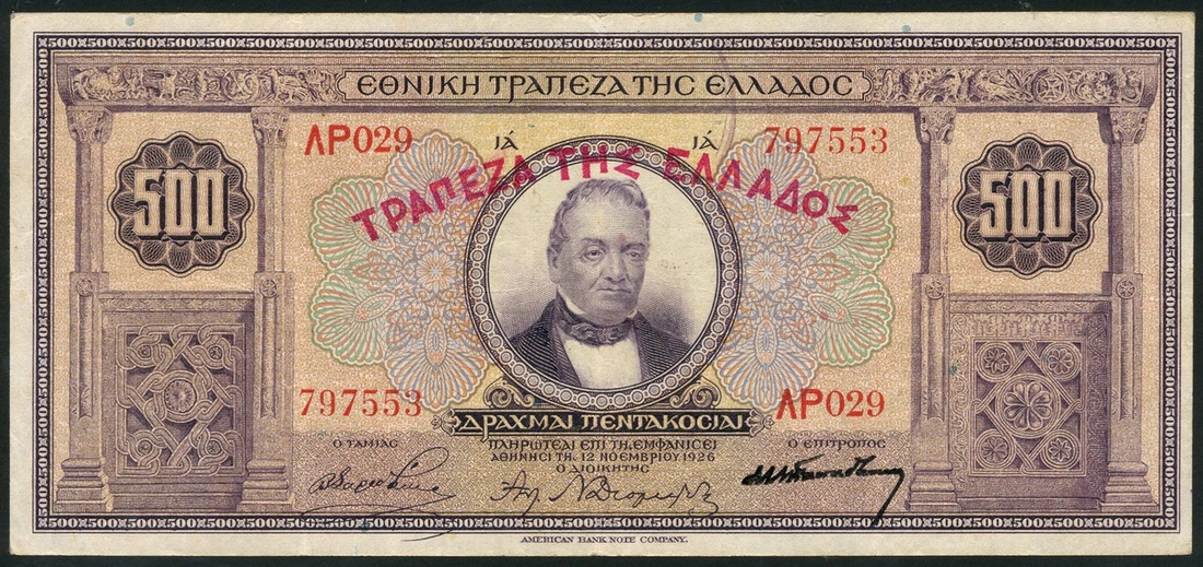 (x) Bank of Greece, Provisional issue, 500 drachmai, 12 November 1926, red serial number LP 797553, purple and pale orange, George Stavros at centre, value at left and right between columns, red BANK OF GREECE overprint, three signatures below, last one black handstamped, reverse purple and pale green, church at centre, eagle at left, winged lion at right
