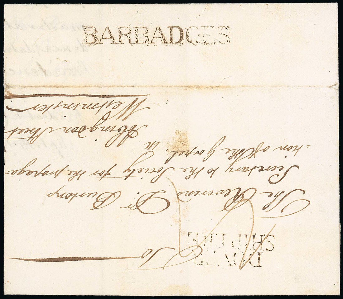 1766 (30 May) entire to Rev. Dr. Burton at the Christian Missionary centre in London showing, on reverse, largely fine large "barbadoes" handstamp (PS3) and two Bishopmarks (1.4), light "dover/ship lre" handstamp on face; docketed internally "Bahamas, a letter from Mr. Bascome, schoolmaster at New Providence, dated Jan. 6 1766. Read at Committee Sept. 15 1766". A rare handstamp with only about six examples recorded. Photo