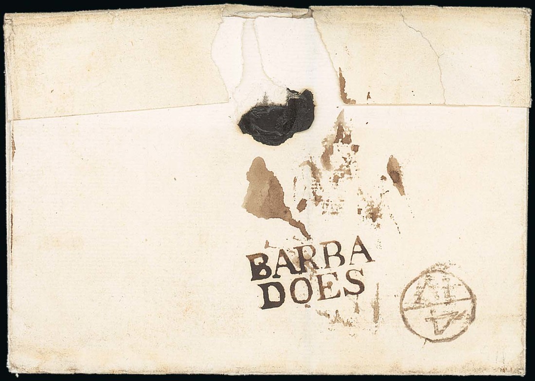 1797 (30 Dec.) entire "By the Packett" to Rev. Dr. Bearcroft "at the Charterhouse" London, rated "1N6" and showing, on reverse, fine "barba/does" handstamp (PS2) alongside Bishopmark (4.4). Photo
