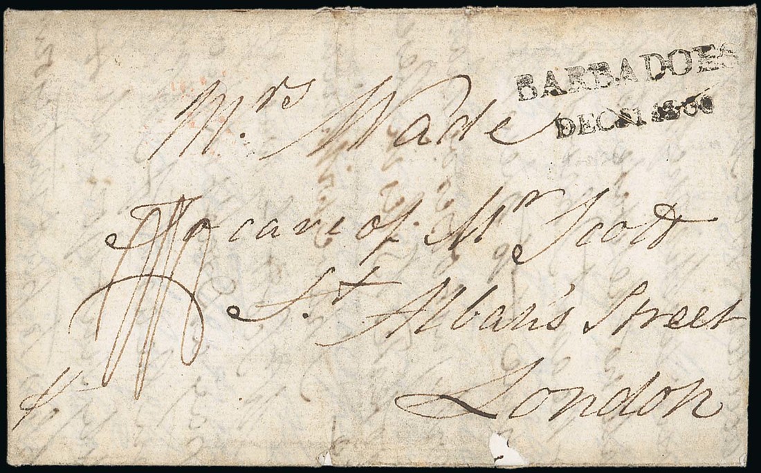 1800 (28 Nov.) entire letter from Berbice to London, rated "1/8" and showing a good strike of the very rare "barbadoes/dec 1 1800" datestamp (PS5); a couple of small perimeter faults, otherwise fine. Only three examples of this handstamp recorded. Photo