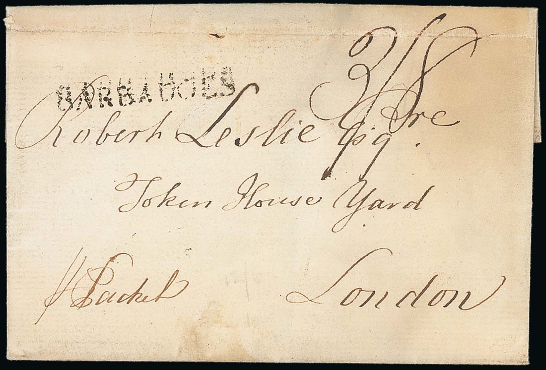 1803 (late) entire "p Packet" to London, rated "3/8"" alongside doubled strike of "barbadoes" handstamp (PS6); horizontal crease at top clear of the handstamp. Photo