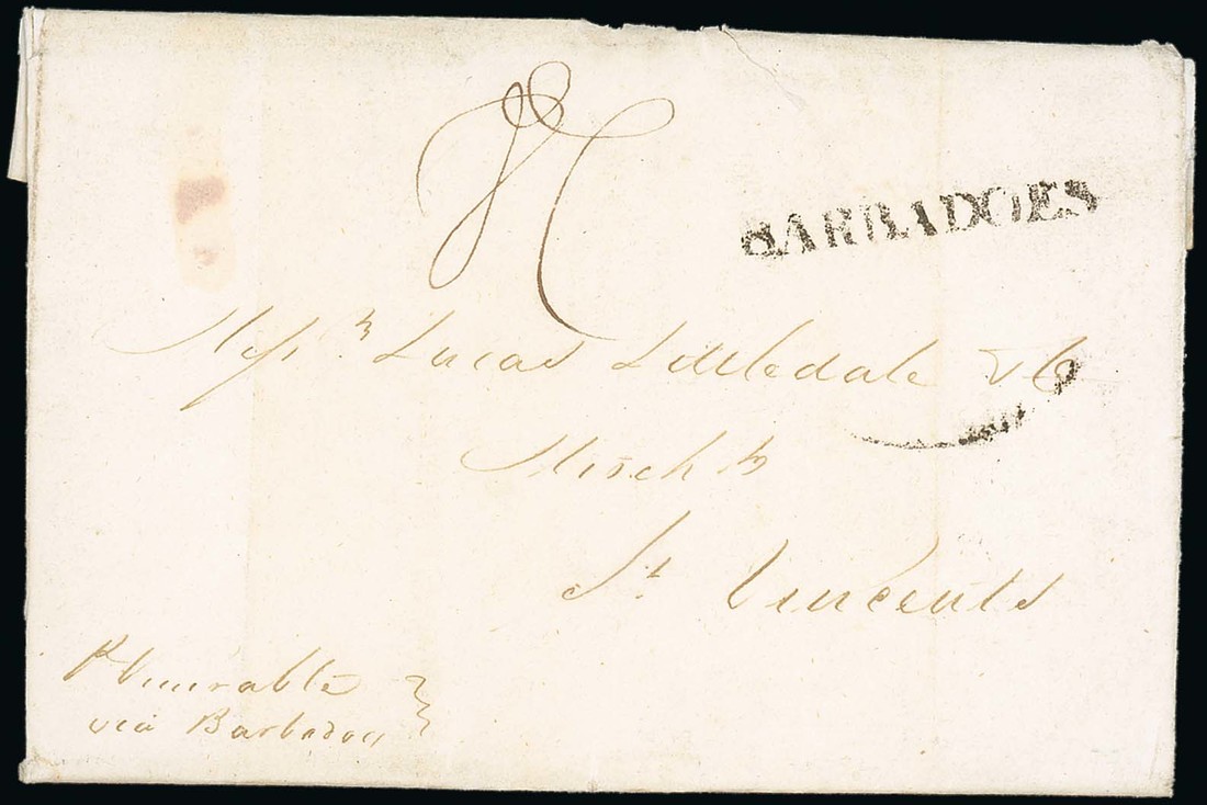 1808 (1 Feb.) entire letter from Liverpool "via Barbados" to St. Vincent showing largely fine "barbadoes" handstamp (PS6) on face. Photo