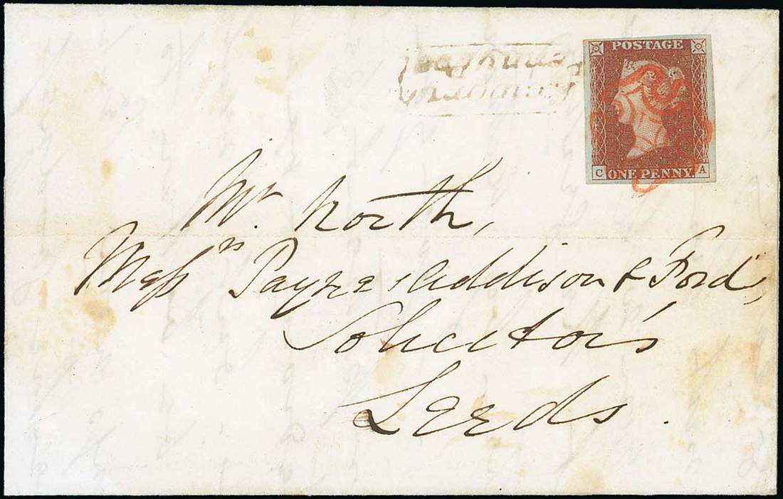 Plate 11: CA good to very large margins all round, tied by a wonderful strike of the extremely rare orange-red Maltese Cross of Ixworth, to entire letter, dated 2 July 1841 to Leeds, a framed "Ixworth/Penny Post" additionally just ties the adhesive, dated markings of Bury St. Edmonds and Leeds on the reverse; light horizontal filing fold and slight stains not detracting from this marvellous entire. M. Jackson Certificate (2017). Specialised AS74va. Photo