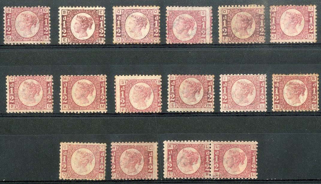 1870 ½d. Plate 1: CR and DQ, Plate 3: EB, Plate 5: SN, Plate 6: PO, Plate 8: JK, Plate 10: FG, Plate 12: KM, Plate 13: PS, Plate 14 EN and JI, Plate 15: BG, Plate 19: QS, Plate 20: GW, LK-LL horizontal pair, unused or part original gum, mixed condition, S.G. 48/49, £3,855