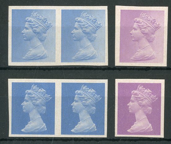 1973 (10 Oct.) undenominated multipositive proof pulls, head type B1, produced during the commissioning of the Jemelle (Gemini) press, horizontal imperforate pairs in pale turquoise-blue and blue, single pulls in pale violet and purple. Good to fine