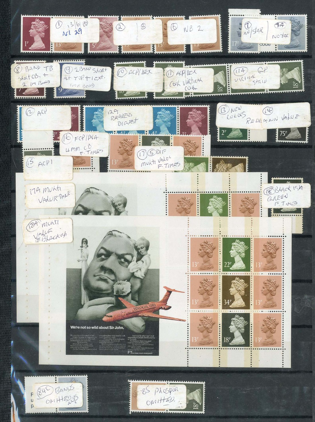 Collection of unmounted mint ½p. to £5 values predominately arranged by Mike Holt new issue listings (circulars included) housed in three volumes and loose in packets, contained in a carton, including phosphor, paper and gum types, 17 pin perf. errors with 26p. rosine, 50p. ochre-brown, coil strips, errors and varieties with some miss-perfs., forgeries with complete (2nd) x 10 booklet. Also few earlier issues mainly used with some commemoratives, etc. Mostly good to fine with very careful inspection essential. (thousands)