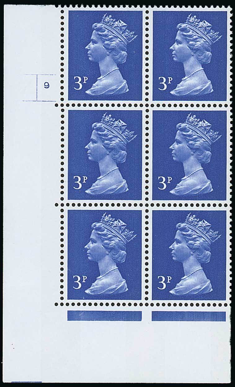 3p. ultramarine, FCP/PVA, two bands, block of six perforation Type A, cylinder number 9 phosphor 7 no dot. Fine unmounted mint. Rare. S.G. U103, £1,800. Photo