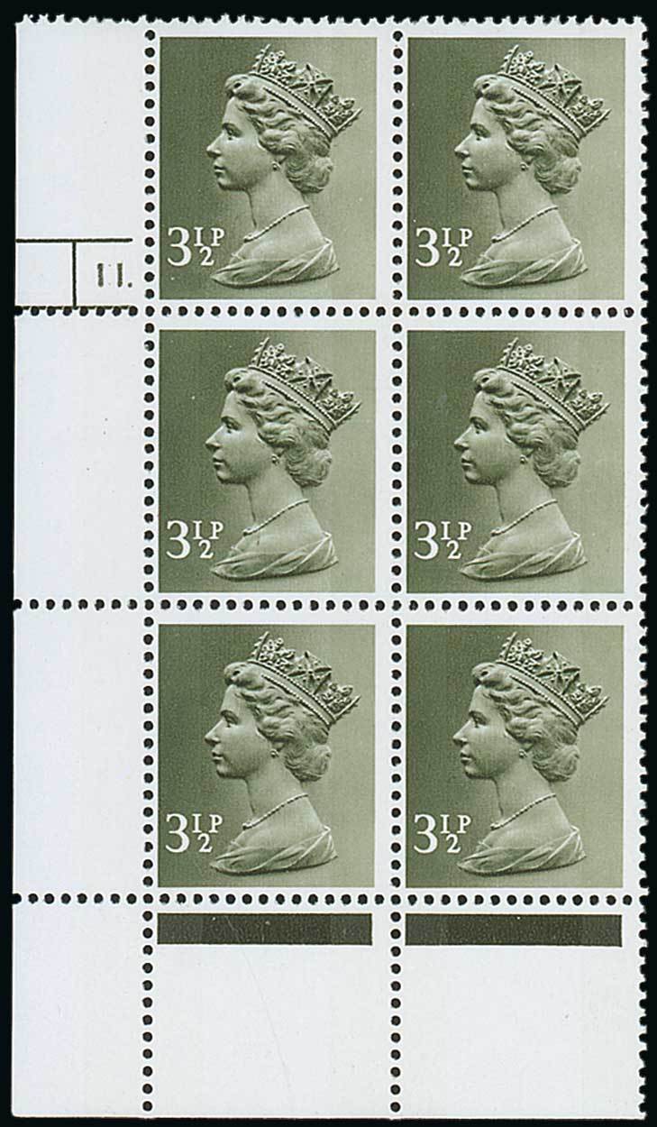 3½p. deep olive-green, OCP/PVAD, two bands, block of six, cylinder number 11 phosphor 17 no dot. Fine unmounted mint. Rare. S.G. U117, £1,600. Photo