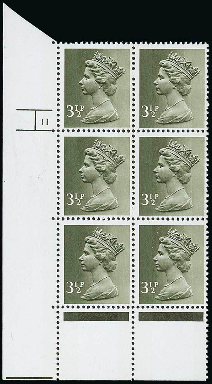 3½p. deep olive-green, OCP/PVAD, two bands, block of six, cylinder number 11 phosphor 17 dot. Fine unmounted mint. Rare. S.G. U117, £2,250. Photo
