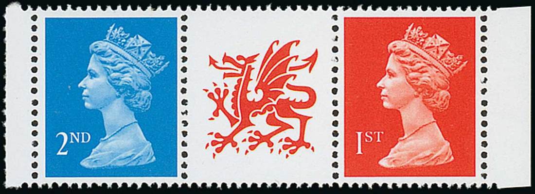 Lithograph Questa: 33p. from top right corner of the booklet pane, 1989-93 (2nd) bright blue in se-tenant pair with (1st) bright orange-red with label inbetween; all phosphor omitted. Fine unmounted mint. S.G. X1020Ey, 1451aEy, 1541aEy, £2,475. Photo