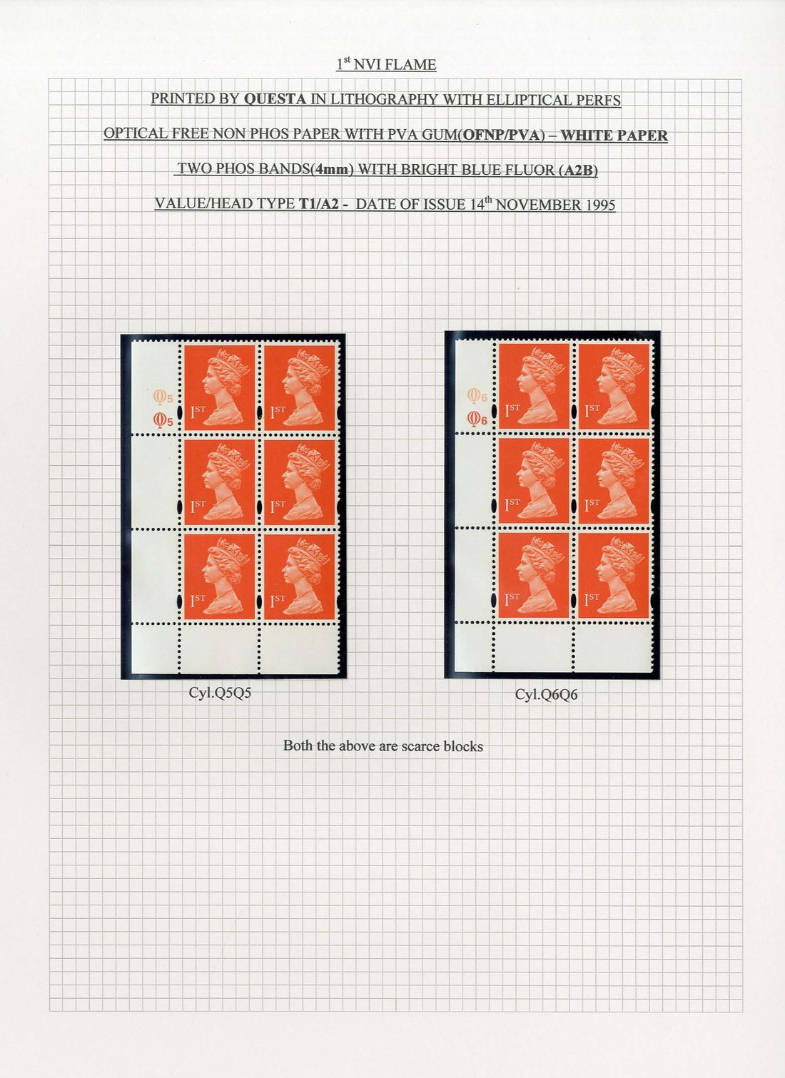 A comprehensive study of NVI issues neatly presented in three albums, contained in a carton, with paper/gum types and cylinder blocks, etc., and including (2nd) 1993, OFNP/PVA, phosphor omitted, 1996, OFNP/PVA, blue flour, cylinder number Q7Q7, (1st.) 1995, OFNP/PVA, blue flour, cylinder number Q5Q5, Q6Q6; also a further album of 1990 Penny Black Anniversary issue with cylinder blocks, etc. Fine unmounted mint. (hundreds)