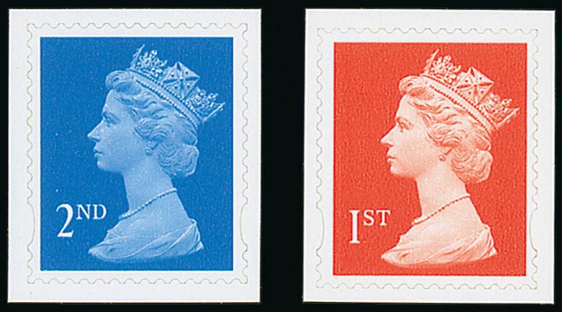 1998-2001 Self-adhesive, perforation 14½ x 14, die-cut, (2nd.) bright blue and (1st.) bright orange-red. Fine and scarce. S.G. 2039b, 2040b, £600. Photo