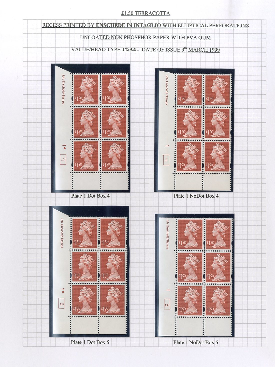 £1.50 to £5 recess-printed high values specialised collection neatly presented in an album including plate 1 blocks of six with Enschedé £1.50 number 4 dot and no dot, £2 number 10 no dot, 12 no dot, £3 number 6 dot, 7 no dot, 8 dot, 10 no dot, and De La Rue including both dull and bright flourescent inks. Also 1993 £10 (6, one used). Fine unmounted mint. (hundreds)