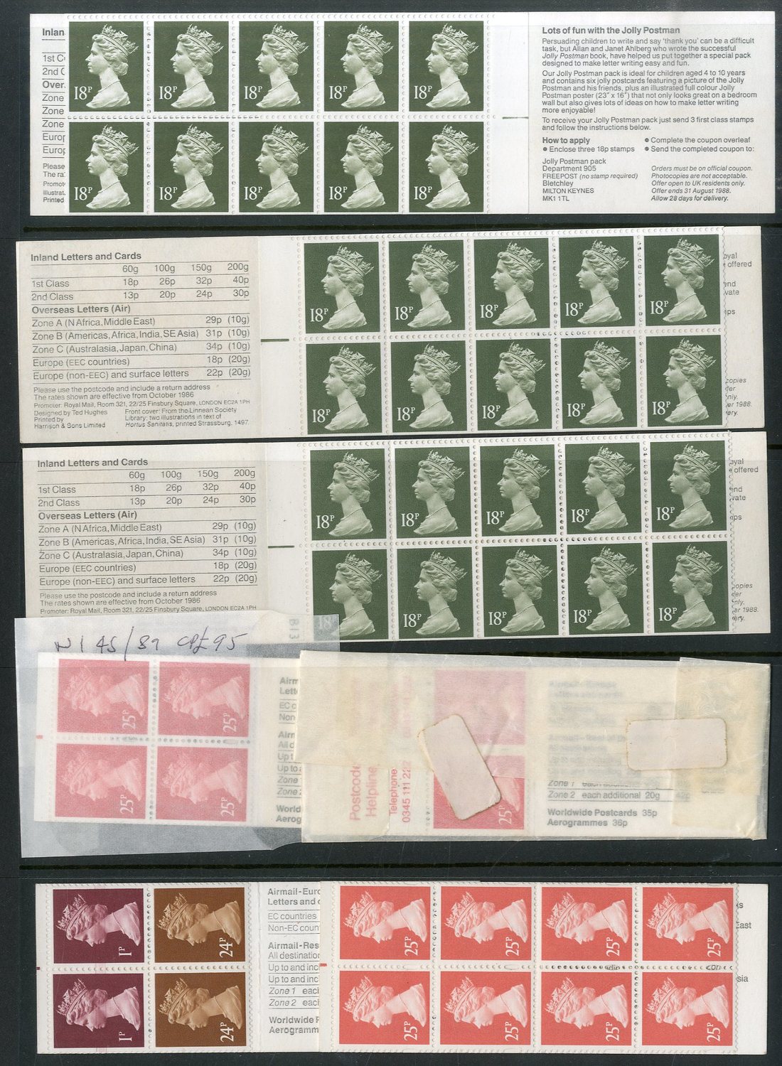 Selection of booklets and booklet panes all with missing phosphor arranged on stock sheets including Folded 50p. 1987-88 Botanical Gardens Mount Stewart (FB45a), 1988 London Zoo Pigs (FB47), 1989 Aircraft HP42 (FB55) trimmed perfs., £1 1995 WWII Anniversary Archibald McIndoe (FH39), Window 2000 printed by Questa (HD52); also Miscut with Folded £1 1995 R. J. Mitchell (FH38), £1.80 Wolf and birds (FU66), cylinder B13 (straight edge at foot). Generally good to fine. (19 items)