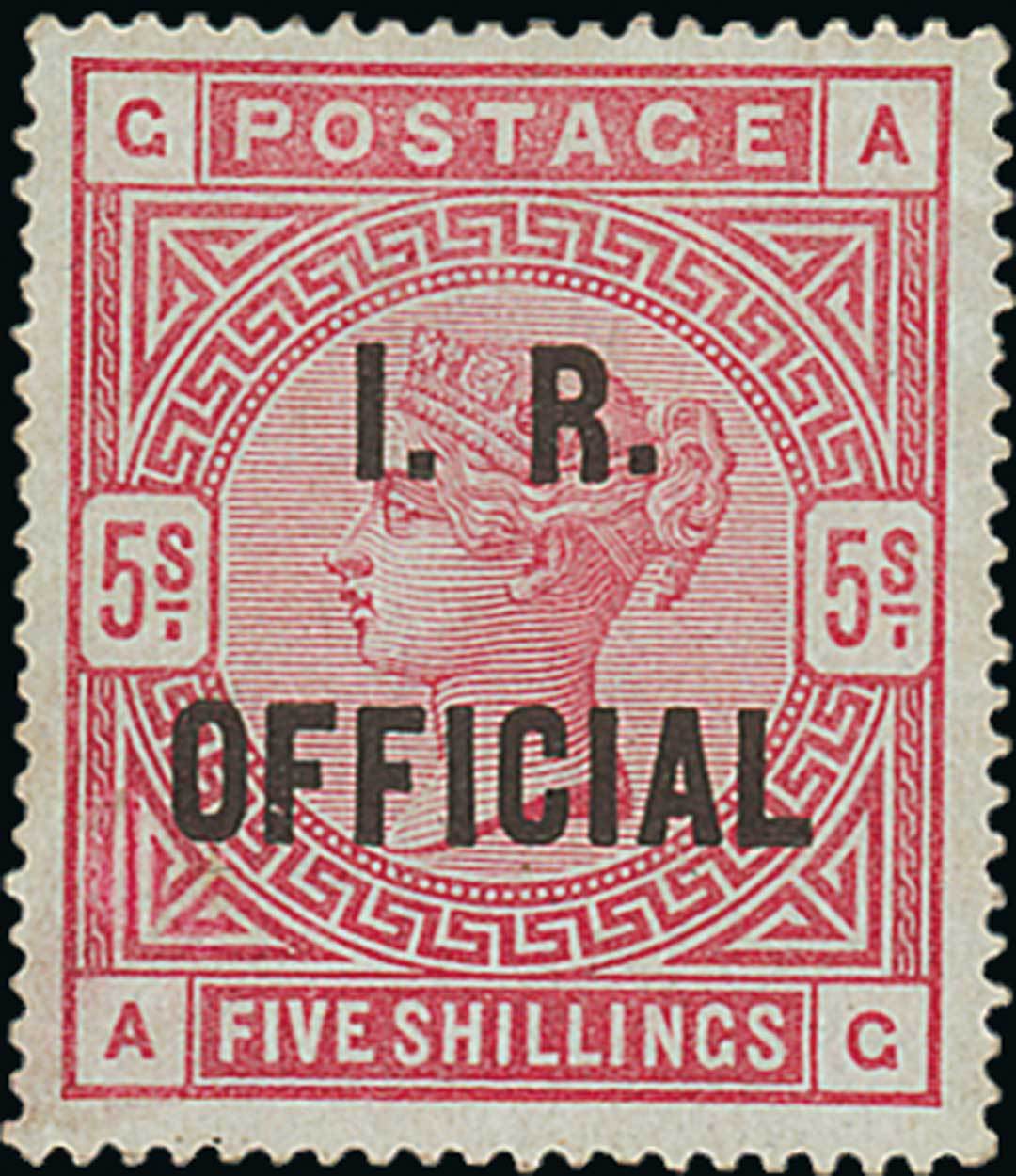 Issues of 1884-88 5/- rose on blued paper, AG "raised stop variety", part original gum; a trifle soiled and slightly rubbed at lower left, fine appearance and a very rare stamp. B.P.A. Certificate (2015). S.G. O8a, £18,500. Photo