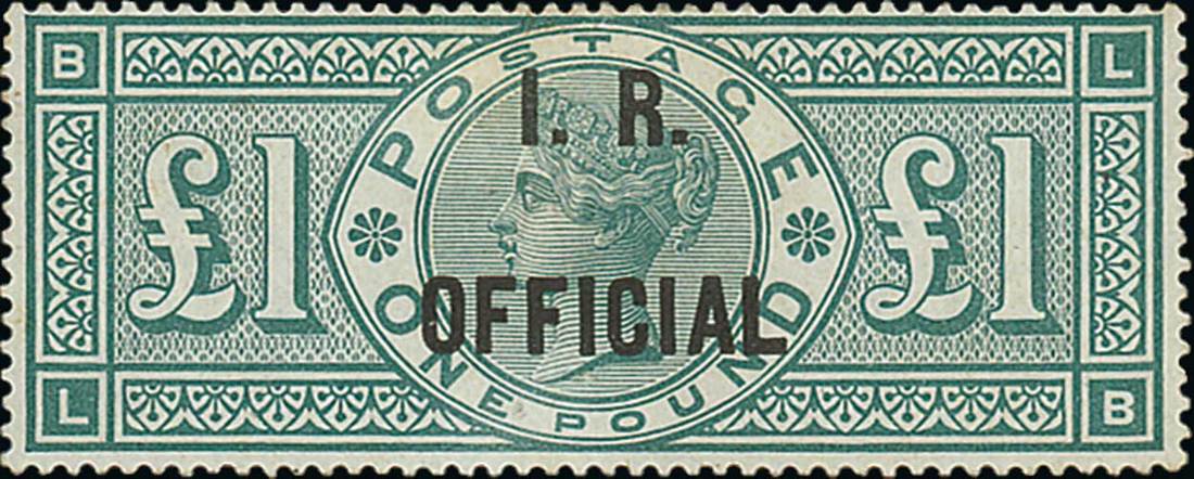 Issues of 1887-92 £1 green, LB, original gum, two small handstamps on reverse; a fine example of this rare high value Official. S.G. O16, £12,000. Photo